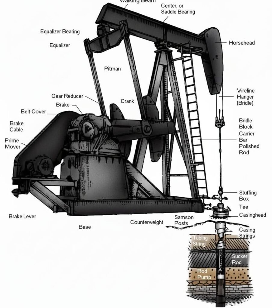 This image clearly illustrates the components and working principle of a Pumpjack, one of the most widely used artificial lift systems for oil wells when natural reservoir pressure is no longer sufficient to bring fluids to the surface.